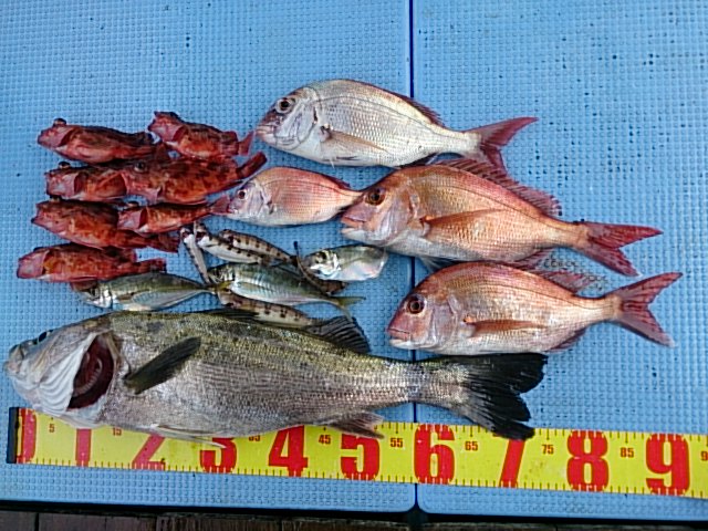 釣果 スズキ1匹・77センチ[タイカブラ]/マダイ3匹(40センチ・41センチ・44センチ)[タイカブラ]/マアジ3匹(21センチ~23センチ)/ガシラ7匹(17センチ~21センチ)/カスゴ1匹・26センチ/トラギス5匹(11センチ~18センチ)