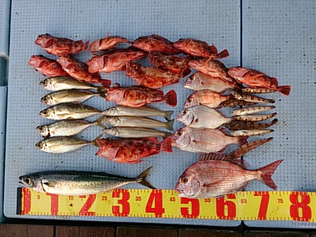 釣果 マダイ1匹・33センチ[タイカブラ]/マサバ1匹・42センチ/マアジ5匹(21センチ~23センチ)/ガシラ12匹(15センチ~23センチ)/カスゴ1匹・25センチ/チャリコ3匹(17センチ~20センチ)/キス3匹(21センチ~23センチ)/トラギス8匹(10センチ~15センチ)