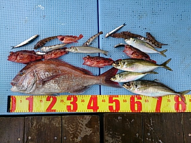 釣果 マダイ1匹・56センチ[胴付き三本針 青イソメ]/マアジ4匹(22センチ~32センチ)/ガシラ5匹(16センチ~22センチ)/キス1匹・22センチ/トラギス7匹(12センチ~16センチ)