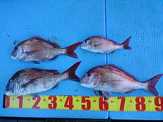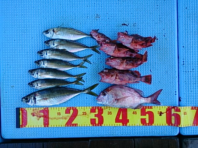 釣果 マダイ4匹(32センチ・46センチ・47センチ・50センチ)[川合オリジナルタイカブラ]/マアジ7匹(23センチ~32センチ)/ガシラ5匹(18センチ~22センチ)