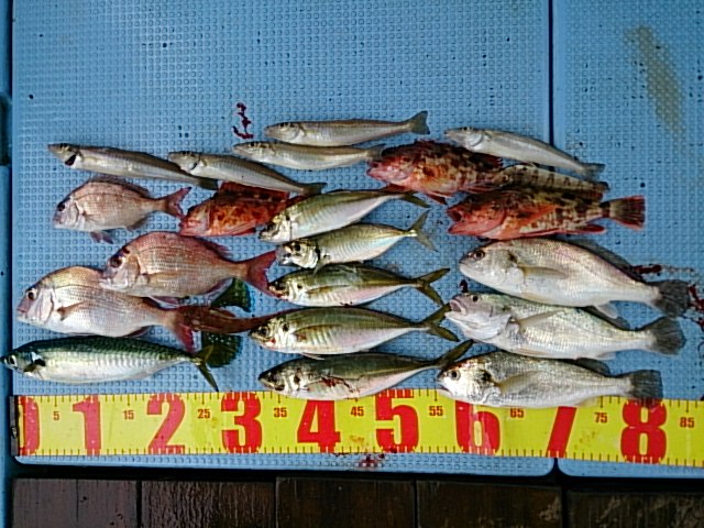釣果 ホウボウ1匹・18センチ/マサバ1匹・35センチ/マアジ5匹(22センチ~30センチ)/ガシラ3匹(10センチ~25センチ)/カスゴ1匹・27センチ/チャリコ2匹(18センチ~24センチ)/イシモチ3匹(27センチ~28センチ)/キス5匹(21センチ~23センチ)/トラギス1匹・14センチ