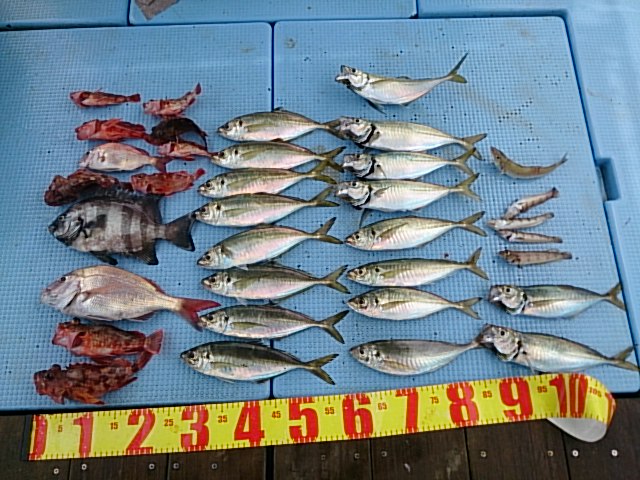釣果 マダイ1匹・36センチ[タイカブラ]/イシダイ1匹・32センチ/マアジ18匹(28センチ~38センチ)/ガシラ8匹(15センチ~21センチ)/チャリコ1匹・21センチ/キス1匹・21センチ/トラギス4匹(14センチ~16センチ)