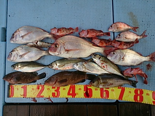 釣果 マダイ3匹(35センチ・38センチ・45センチ)[タイカブラ]/アコウ2匹(29センチ・35センチ)[タイカブラ]/マダイ1匹・32センチ[胴付き・アオイソメ]/イサキ1匹・30センチ/マアジ3匹(30センチ~32センチ)/ガシラ5匹(15センチ~20センチ)/チャリコ2匹(1 9センチ・21センチ)/イシモチ1匹・27センチ/トラギス2匹(14センチ・15センチ)