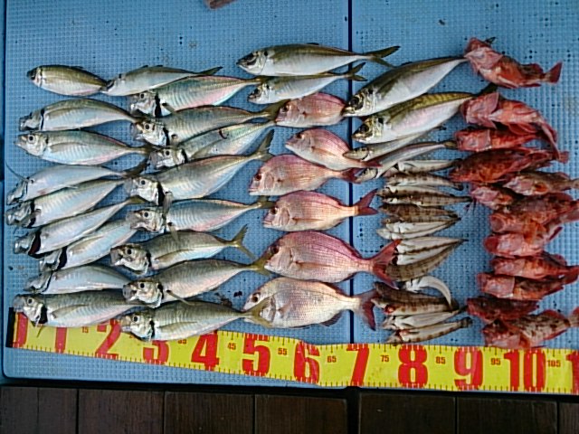 釣果 マアジ22匹(23セセンチ)/ガシラ13匹(17センチ~21センチ)/カスゴ2匹(27センチ・28センチ)/チャリコ4匹(20センチ~24センチ)/キス2匹(19センチ・20センチ)/トラギス17匹(11センチ~18センチ)