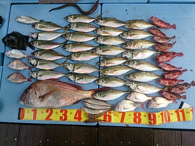 釣果 マダイ1匹・64センチ[タイカブラ]/マアジ28匹(30センチ~35センチ)/ガシラ10匹(17センチ~22センチ)/チャリコ6匹(19センチ~23センチ)/イシモチ1匹・22センチ/キス3匹(20センチ~22センチ)/トラギス2匹(15センチ・16センチ)/イシダイ1匹・28センチ/アナゴ1匹・45センチ