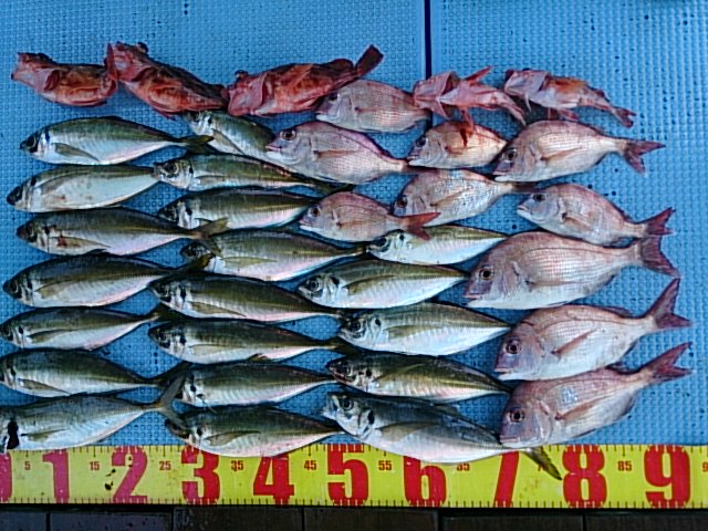 五目&タイラバ&ノマセ! 2015年8月28日 今日は、五目主の色々釣りしました。 タイラバで小さいの1つ拾いましたがノマセダメでした(>__<) また、チャレンジしてくださいね(^^) 眞崎さんの弟さんはじめ、後輩の皆さん、楽しんでくれましたか? 皆さん、マアジ釣れて良かったですね(^^) 優青君、今日もいっぱい釣れて良かったね(^^) 皆さん、また遊びに来てくださいね(^^) 本日はありがとうございました(^^)