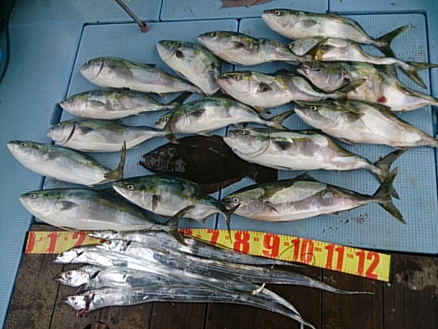 釣果 メジロ16匹(60センチ~72センチ)[ノマセ]/ヒラメ1匹・55センチ[ノマセ]/タチウオ5匹(88センチ~110センチ)[タチウオテンヤ]