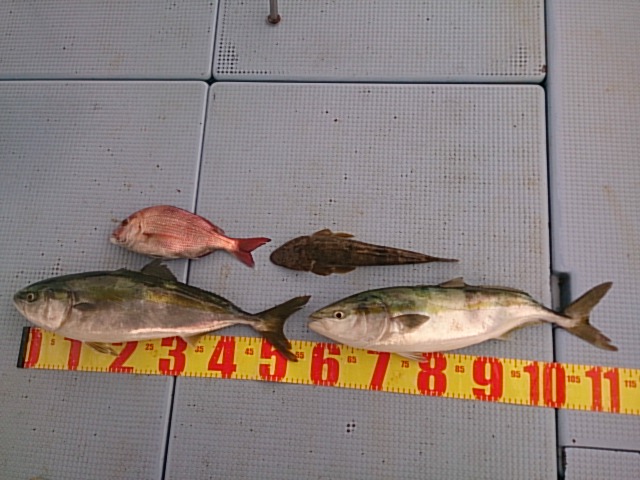 釣果 メジロ2匹(60センチ・63センチ)[ノマセ]/マゴチ1匹・35センチ[タイカブラ]/マダイ1匹・34センチ[タイカブラ]