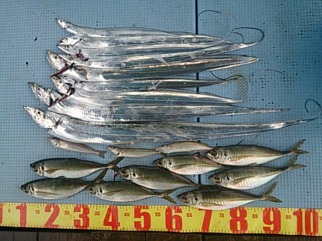 釣果 タチウオ9匹(58センチ~112センチ)[タチウオテンヤ]/マアジ4匹(30センチ~33センチ)/キス3匹(20センチ~22センチ)