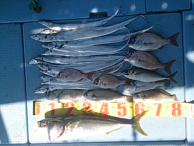 釣果 メジロ1匹・65センチ/タチウオ15匹(63センチ~83センチ)[タチウオテンヤ]/マダイ2匹・30センチ[胴付き3本針]/マアジ1匹・30センチ/チャリコ2匹・22センチ