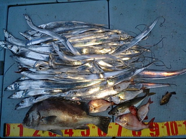 釣果 コショウダイ1匹・55センチ[片天]/タチウオ42匹(63センチ~105センチ)[タチウオテンヤ]/マアジ1匹・32センチ/チャリコ4匹(15センチ~25センチ)/イシモチ1匹・26センチ/ガシラ1匹・15センチ