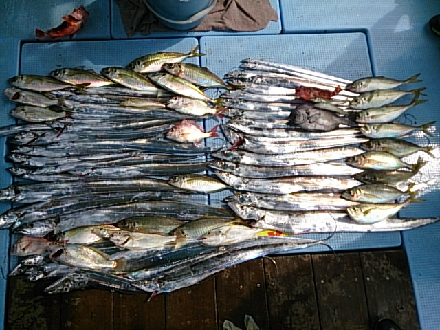 釣果 タチウオ42匹(63センチ~120センチ)[タチウオテンヤ]/マアジ20匹(センチ~35センチ)/イシダイ1匹・29センチ[胴付き仕掛け]/コウイカ1杯[胴付き仕掛け]/ガシラ2匹(22センチ・23センチ)/チャリコ3匹(22センチ~24センチ)/キス4匹(18センチ~2センチ)/イシモチ5匹(23センチ~33センチ)