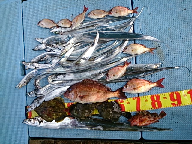 釣果 タチウオ22匹(54センチ~*しっぽ切れ94センチ)[タチウオテンヤ]/マダイ1匹・38センチ[胴付き3本針]/カワハギ3匹(21センチ・23センチ・29センチ)/チャリコ7匹(19センチ~23センチ)/ガシラ1匹・23センチ