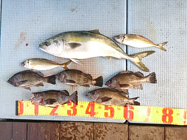 釣果 メジロ1匹・63センチ[ノマセ]/メバル5匹(27センチ~29センチ)[メバル仕掛け]/マアジ2匹