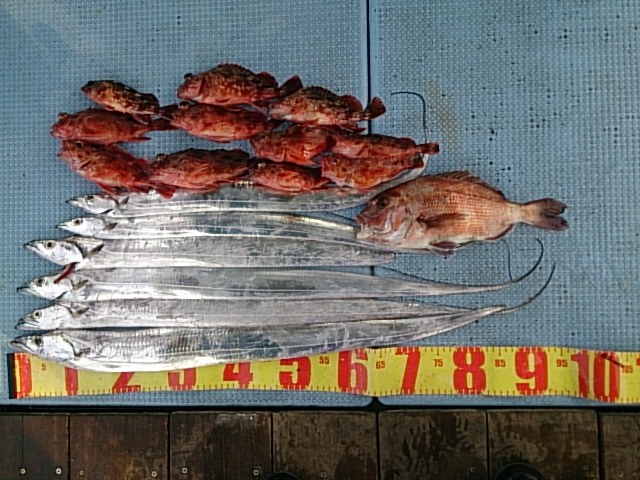 釣果 マダイ1匹・37センチ[胴付き2本針]/タチウオ6匹(82センチ~98センチ尻尾切れ)[タチウオテンヤ]/ガシラ11匹(18センチ~22センチ)