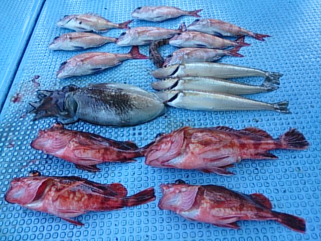 ガシラ3匹/チャリコ8匹/キス3匹/トラギス1匹/胴付きでコウイカ1杯釣れる