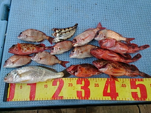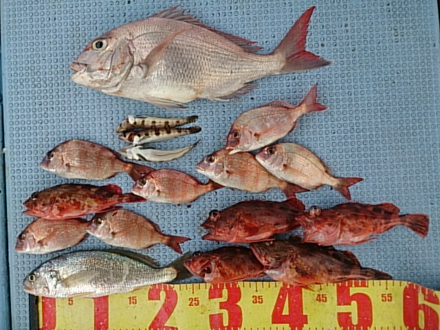 釣果 マダイ1匹42センチ[ヒトツテンヤ]/五目でガシラ5匹 チャリコ7匹 イシモチ1匹 トラギス3匹釣れる
