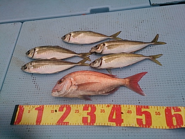 釣果 マダイ1匹・40センチ[タイカブラ]/マアジ5匹(33センチ~35センチ)