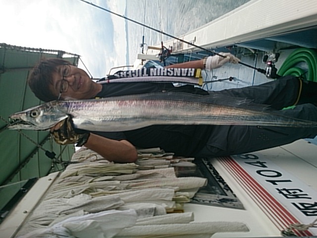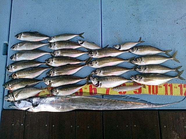 釣果 マアジ23匹(32センチ~39センチ)/マアジ2匹(23センチ・25センチ)/タチウオ1匹・125センチ/マルアジ1匹28センチ/ キス1匹・24センチ