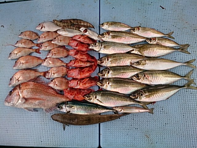 釣果 マダイ2匹(50センチ・チャリコ)[タイカブラ]/マアジ14匹(23センチ~38センチ)/マサバ1匹・38センチ/カスゴ2匹(25センチ・27センチ)/チャリコ11匹(17センチ~23センチ)/ガシラ7匹(15センチ~23センチ)/エソ匹・43センチ/ キス1匹・21センチ/イシモチ2匹(18センチ・21センチ)/トラギス5匹(12センチ~15センチ)