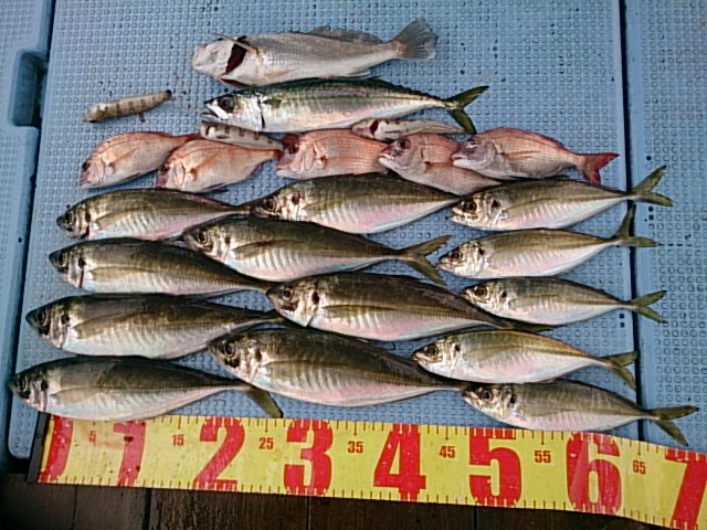 釣果 マアジ8匹(30センチ~37センチ)/マアジ5匹(23センチ~26センチ)/マサバ1匹・34センチ/チャリコ5匹(18センチ~21センチ)/イシモチ1匹・30センチ/トラギス3匹(12センチ~14センチ)