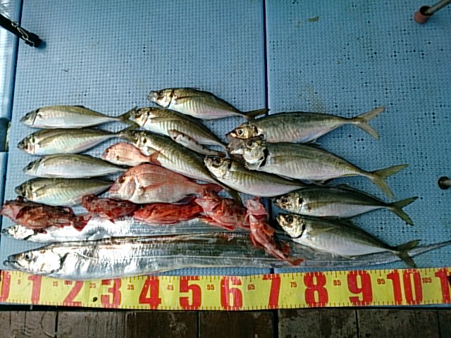 釣果 マアジ11匹(32センチ~40センチ・42センチ)/タチウオ2匹(90センチ・125センチ)[タチウオテンヤ]/マダイ1匹・33センチ/ガシラ5匹(18センチ~24センチ)/チャリコ1匹・18センチ/トラギス1匹・17センチ/豆アジ混じる