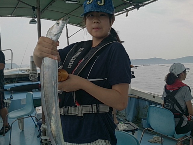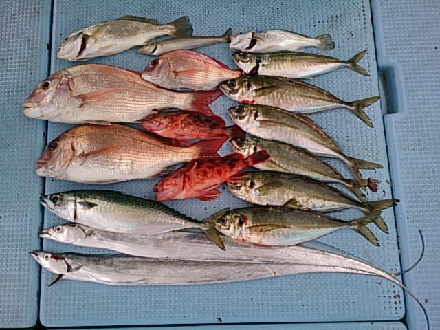 釣果 雪乃ちゃんマダイ2匹(43センチ・45センチ)[タイカブラ]/マサバ1匹・40センチ[タイカブラ]/ガシラ2匹(22センチ・25センチ)[タイカブラ]/タチウオ2匹(83センチ・85センチ)[タイカブラ]/マアジ6匹(32センチ~36センチ)/タチウオ2匹(83センチ・85センチ)/カスゴ1匹・27センチ/キス1匹・22センチ/イシモチ2匹(23センチ・30センチ)
