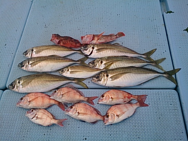 釣果 マアジ8匹(25センチ~37センチ)/チャリコ6匹(18センチ~23センチ)/ガシラ2匹/豆アジ混じる