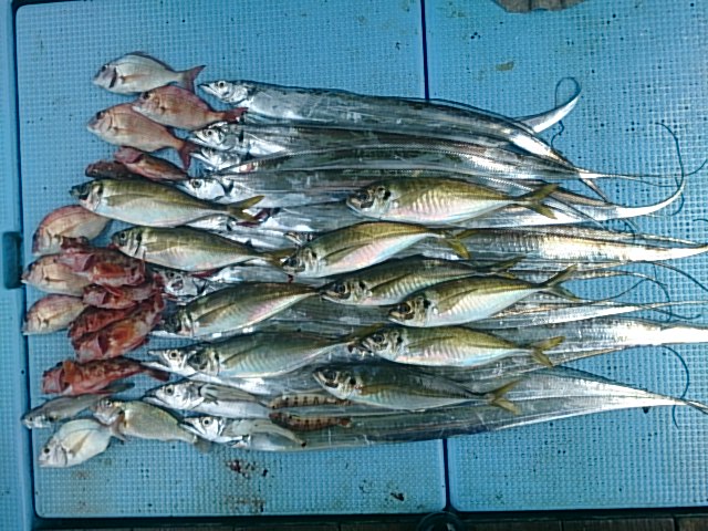 釣果 タチウオ20匹(70センチ~105センチ)[タチウオテンヤ]/マアジ10匹(32センチ~35センチ)/チャリコ7匹(18センチ~22センチ)/ガシラ7匹(13センチ~22センチ)/トラギス4匹(12センチ~15センチ)/イシモチ2匹(20センチ~22センチ)