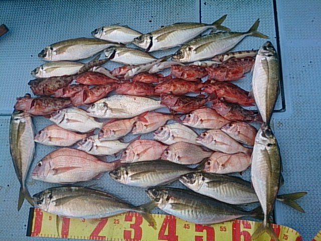 釣果 マダイ1匹・33センチ[胴付き仕掛け]/マアジ13匹(26センチ~41センチ)/チャリコ12匹(19センチ~23センチ)/ガシラ15匹(12センチ~22センチ)/トラギス7匹(13センチ~19センチ)/イシモチ1匹・30センチ