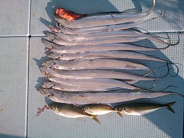 釣果 タチウオ11匹(72センチ~100センチ)[タチウオテンヤ]/マアジ3匹(26センチ~35センチ)/ガシラ1匹・19センチ