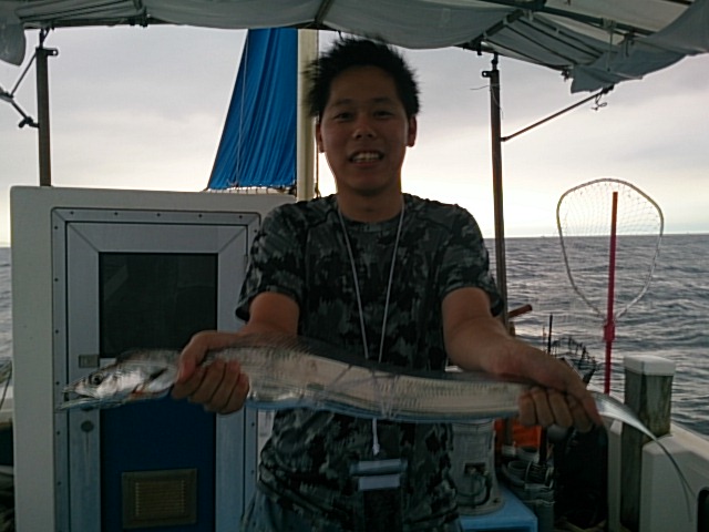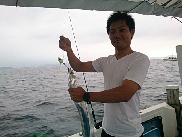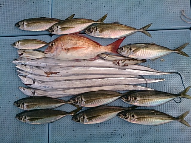釣果 マダイ1匹・42センチ/マアジ11匹(26センチ~36センチ)/タチウオ5匹(73センチ~92センチ)[タチウオテンヤ]/キス1匹22・センチ)/イシモチ1匹・20センチ/トラギス1匹・16センチ