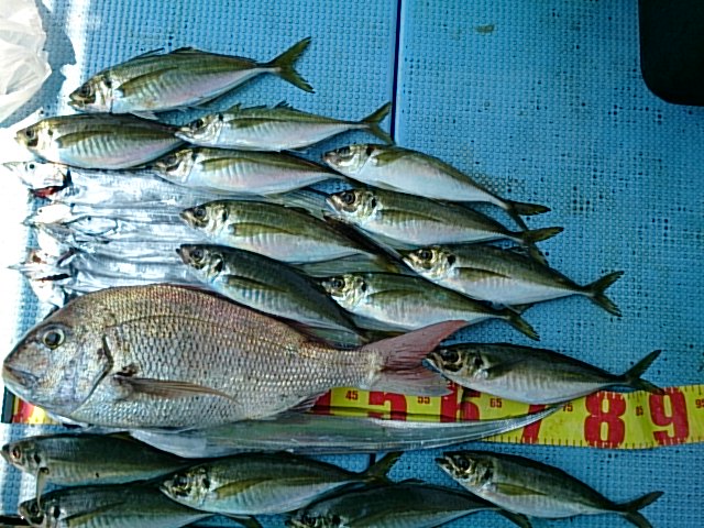 釣果 マダイ1匹・64センチ[落とし込みサビキ]/マアジ16匹(32センチ~37センチ)/タチウオ8匹(62センチ~90センチ)[タチウオテンヤ]