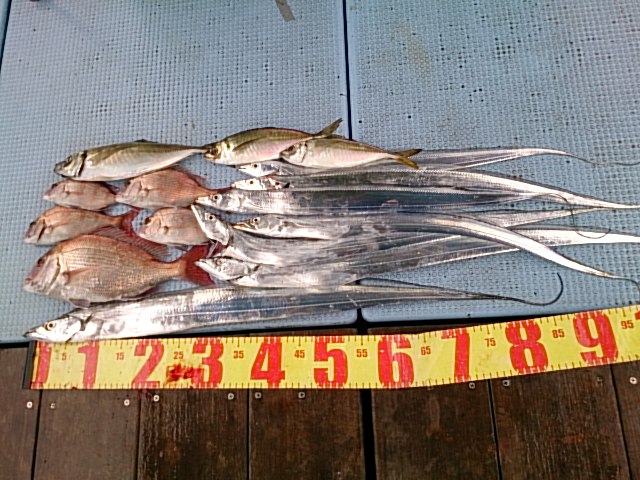釣果 マダイ1匹・36センチ[タイカブラ]/チャリコ4匹[タイカブラ]/タチウオ7匹(67センチ~93センチ)[タイカブラ]/マアジ3匹(26センチ~35センチ)/