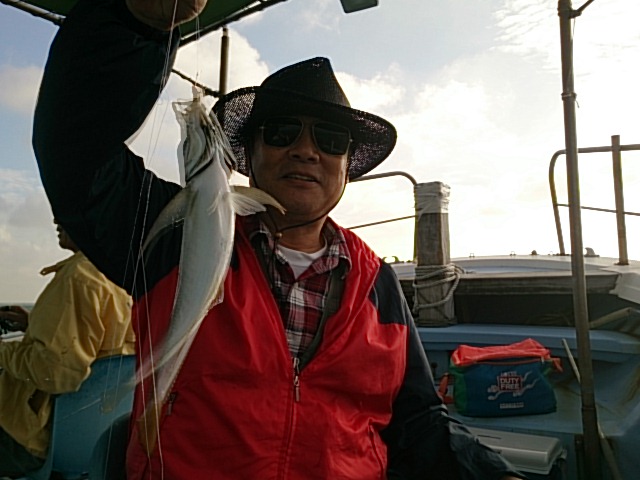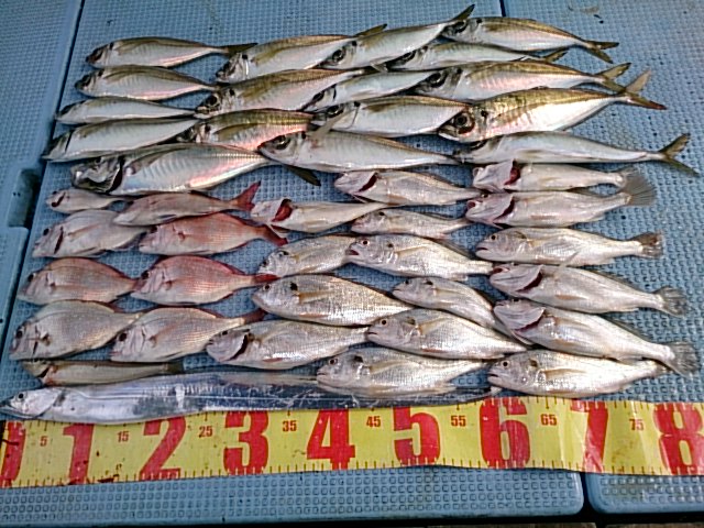 釣果 マアジ17匹(27センチ~36センチ)/イシモチ16匹(21センチ~24センチ)/チャリコ8匹(15センチ~22センチ)/タチウオ1匹・79センチ[胴付き仕掛け]/キス1匹・21センチ