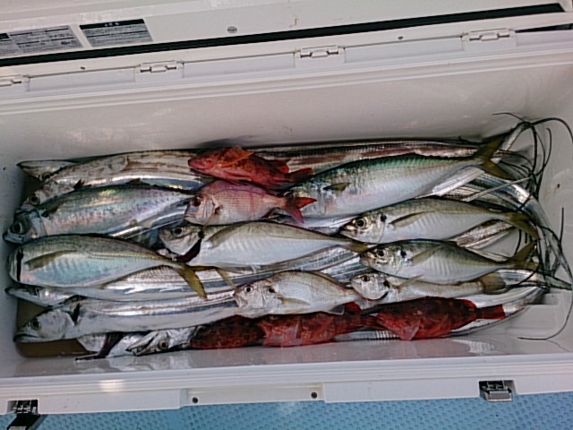 釣果 マサバ2匹(38センチ・39センチ)/マアジ4匹(28センチ~35センチ)/イシモチ2匹(23センチ・24センチ)/タチウオ19匹(72センチ~102センチ)[タチウオテンヤ]/ガシラ4匹(17センチ~18センチ)/チャリコ1匹・20センチ