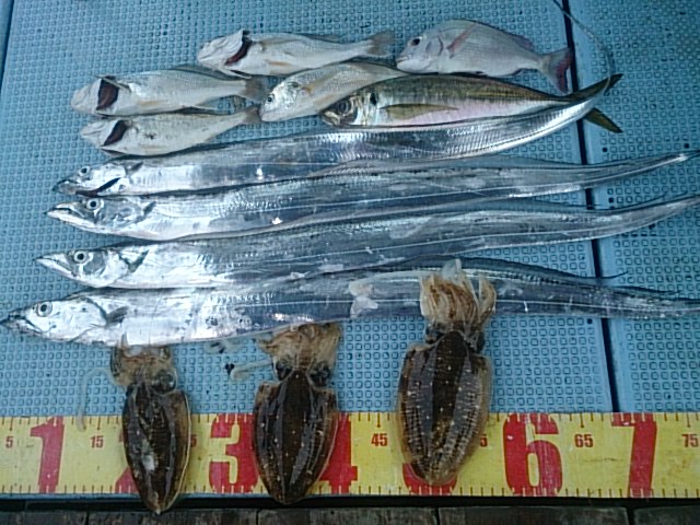 釣果 コウイカ3杯(胴長13センチ~胴長15センチ)[バーチカル]/マアジ1匹・ 35センチ/チャリコ1匹・22センチ/イシモチ4匹(22センチ~25センチ)/タチウオ4匹(83センチ~94センチ)[タチウオテンヤ]