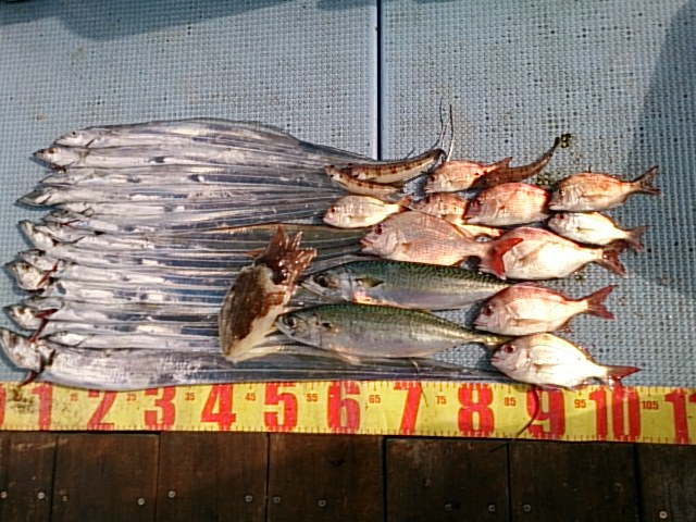 釣果 タチウオ14匹(69センチ~104センチ)[タチウオテンヤ]/コウイカ1杯・胴長16センチ[胴付き仕掛け]/マサバ2匹・41センチ)/チャリコ10匹(16センチ~24センチ)/トラギス3匹(14センチ~17センチ)