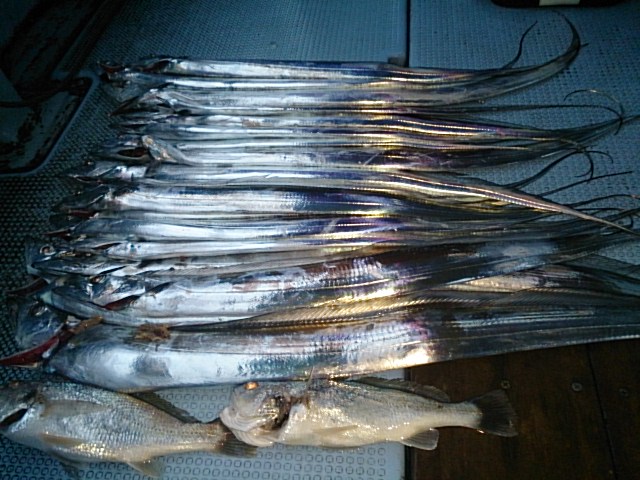 釣果 タチウオ全員坊主なしの全員メーターオーバー釣られました(76センチ~110センチ・112センチ)[タチウオテンヤ]/イシモチ2匹(28センチ・32センチ)