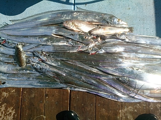 釣果 タチウオ坊主なしの全員二桁54匹(77センチ~125センチ)[タチウオテンヤ]/コウイカ1杯[アンチョビミサイル]/イシモチ2匹・33センチ[タチウオ枝針]