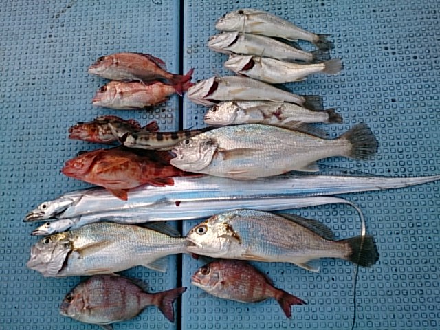 タチウオ2匹+ガシラ2匹[ジギング ]/五目釣りでチャリコ3匹/イシモチ8匹