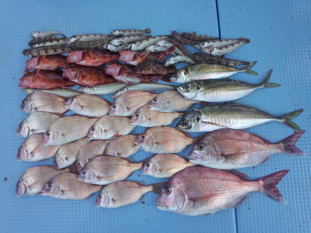 釣果 マダイ2匹(32㎝・37㎝)/マアジ3匹(28㎝~36㎝)/ガシラ7匹(16㎝~22㎝)/チャリコ18匹(16㎝~23㎝)/キス3匹(20㎝~22㎝)/トラギス19匹(11㎝~15㎝)/