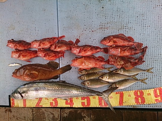 サワラ1匹・75センチ[落とし込みサビキ]/アコウ1匹・40センチ[落とし込みサビキ]/ガシラ10匹(19センチ~25センチ)[落とし込みサビキ]/マアジ6匹(20センチ~22センチ)