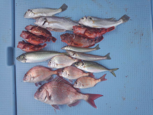 釣果 マダイ1匹・34㎝/マアジ1匹・22㎝/マルアジ1匹・30㎝/ガシラ5匹(17㎝~24㎝)/チャリコ4匹(18㎝~24㎝)/キス2匹(20㎝・24㎝)/イシモチ3匹(24㎝~31㎝)