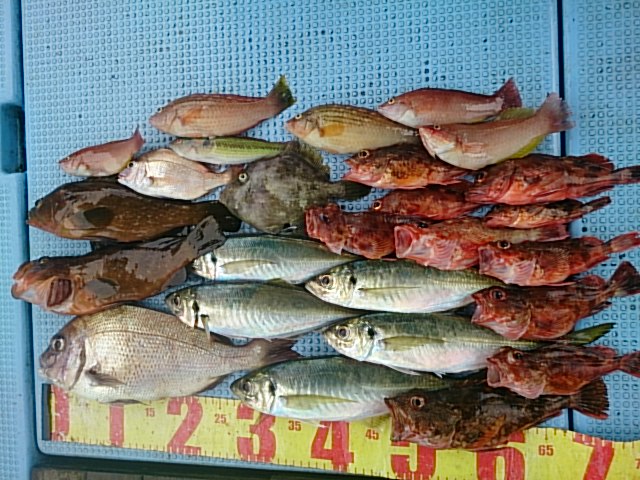 マダイ1匹・39センチ/アコウ2匹(31センチ・33センチ)/マアジ5匹(31センチ~37センチ)/カワハギ1匹・20センチ/ガシラ10匹(18センチ~25センチ)/チャリコ1匹・20センチ/ベラ6匹(18センチ~20センチ)