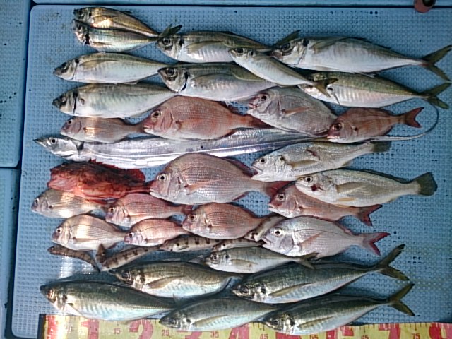 マダイ1匹・32センチ/タチウオ1匹・95センチ[タイカブラ]/マアジ15匹(24センチ~38センチ)/カスゴ3匹(25センチ~29センチ)/ガシラ1匹・25センチ/チャリコ7匹(18センチ~24センチ)/イシモチ2匹(28センチ・29センチ)/トラギス4匹(12センチ~16センチ)