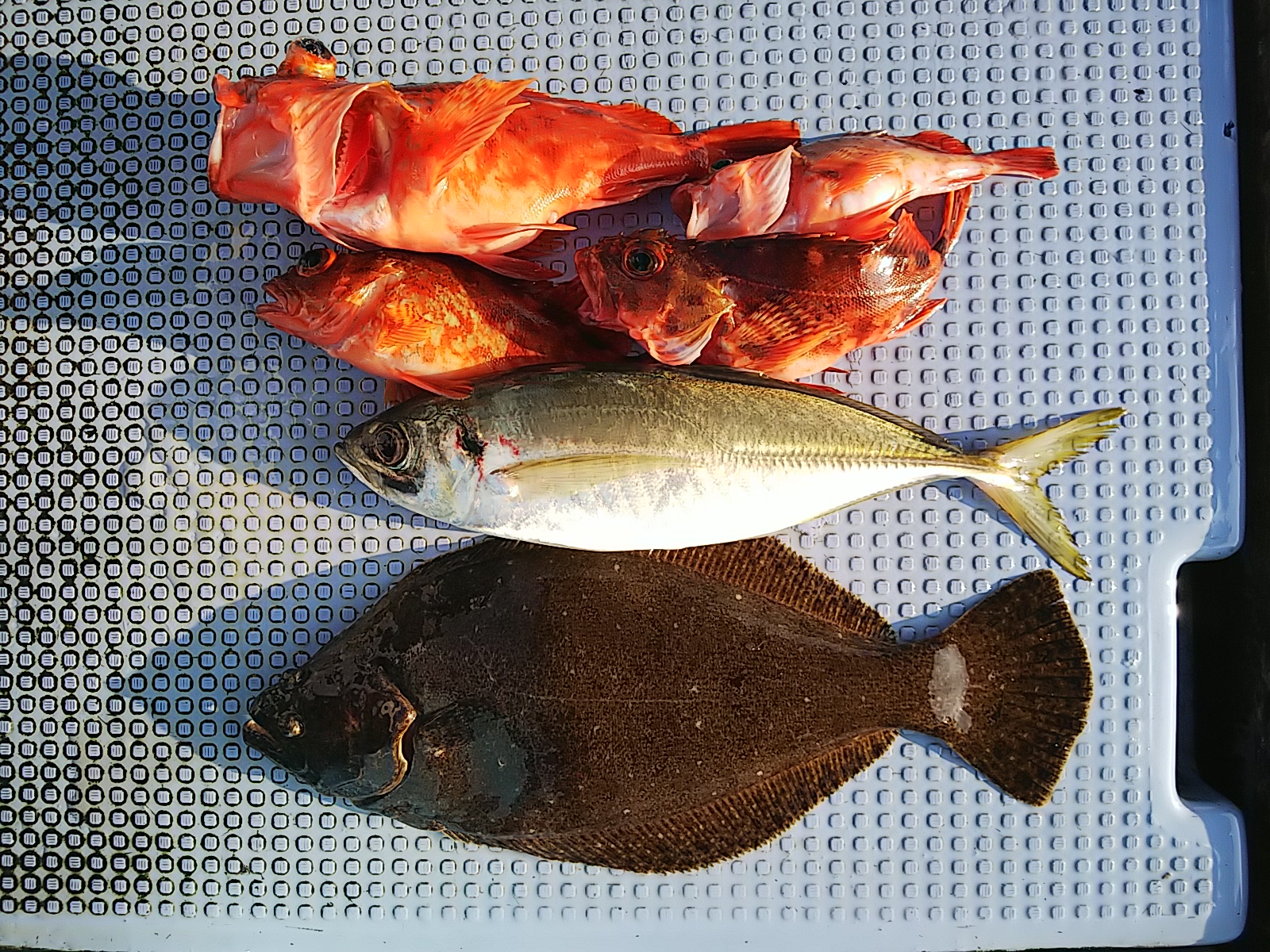 ヒラメ1匹・35センチ[落とし込みサビキ]/マアジ1匹・32センチ/ガシラ4匹