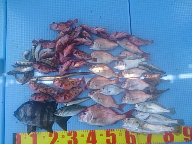 釣果 マダイ1匹・32?/マアジ1匹・24?/ガシラ23匹(13?〜21?)/チャリコ12匹(16?〜23?)/キス1匹・18?/イシモチ3匹(22?〜30?)/トラギス21匹(11?〜14?)/サンバソウ1匹・32?/アナゴ1匹・37?
