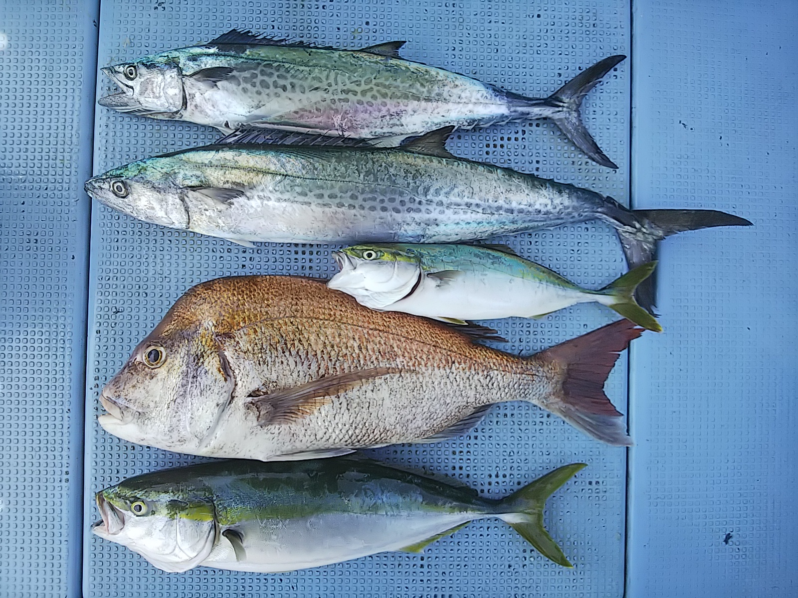 メジロ1匹・63センチ[落とし込み]/サワラ1匹・70センチ[落とし込み]/マダイ1匹・72センチ[落とし込み]/ツバス1匹・45センチ[落とし込み]