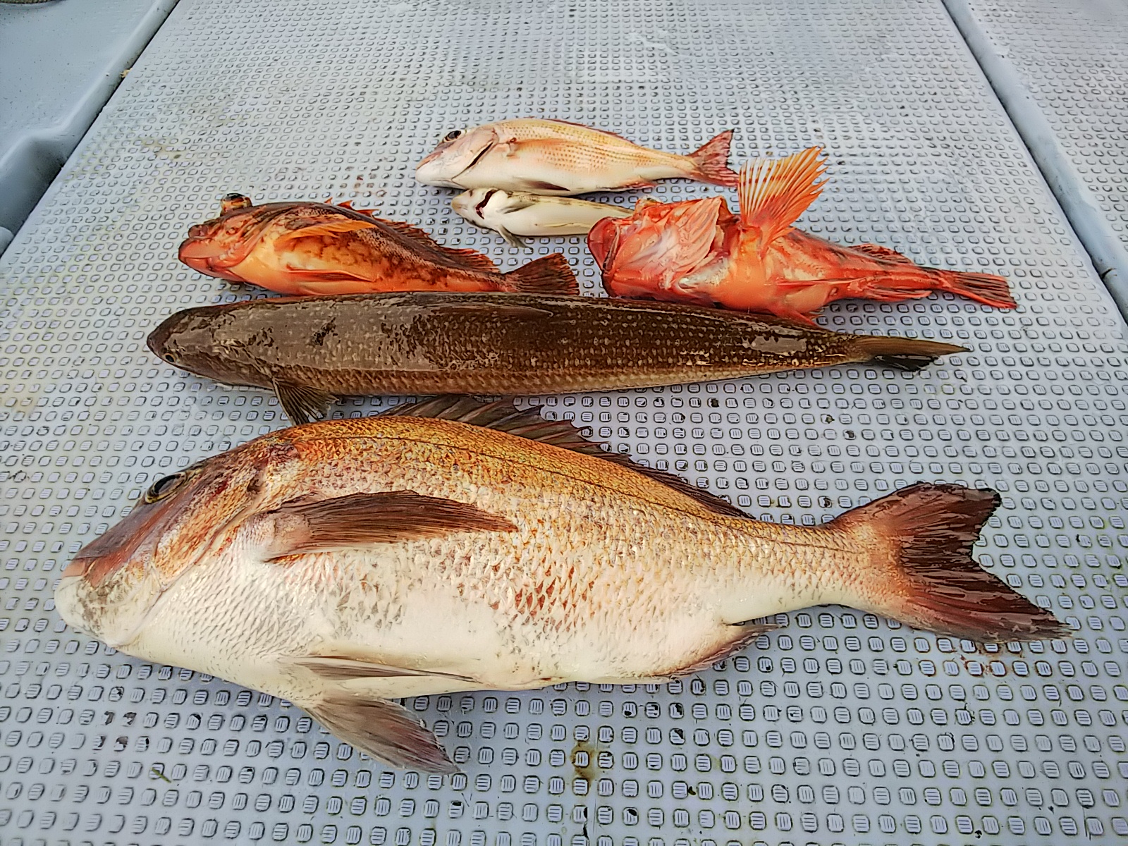 マダイ1匹・44センチ[タイカブラ]/ガシラ2匹(24センチ・25センチ)/チャリコ1匹・24センチ/エソ1匹・46センチ/トラギス1匹・15センチ
